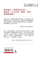 魅力,不僅看不到,也觸摸不到。但它具有一股強大的力量,能夠左右對方的情感與態度。從這一點看來,魅力是強而有力的說服工具。換句話說,沒有魅力的人,不單說服不了他人,說話時,也不能吸引對方,讓人專心聆聽。就算有很棒的想法,以及用來支撐這個想法的論點,但是,如果無法讓對方正確理解這些論點,一切將變得無用武之地。相反地,只要具備吸引他人的特質,便足以說服對方。若能具備幹練的舉止與態度,談話深入人心,那麼妳會變得越來越具說服力。