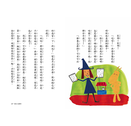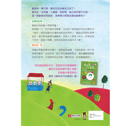 在《猜一猜童話:變色羊不吃青菜》裡,小讀者跟著故事一起進入森林村,不只認識了變色羊、快閃貓、大聲雞、月亮花、長頸鹿雲校長、臭臉獅,也解決了不少謎題。《猜一猜童話:快樂小學運動會》的故事更緊湊、劇情更豐富,角色更多元,快閃貓與變色羊爆笑又有趣的校園生活,使小讀者能夠更加深入故事情境、體會角色性格,學習人物間的關係互動,並與自己的學校生活體驗結合。此外,還能明白推理邏輯的種種技巧,以及數學、科學等知識,是孩子生活中得心應手的好工具喔!