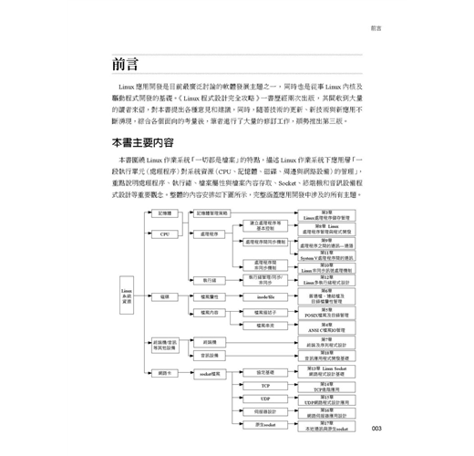 本書圍繞Linux作業系統「一切都是檔案」的特點,描述Linux作業系統下應用層「一段執行單元(處理程序)對系統資源(CPU、記憶體、磁碟、周邊與網路設備)的管理」,重點說明處理程序、執行緒、檔案屬性與檔案內容存取、Socket、終端機和音訊設備程式設計等重要觀念,完全涵蓋應用開發中涉及的所有內容。