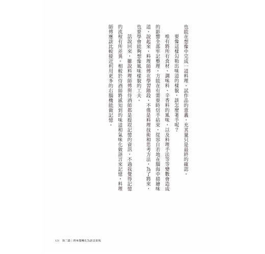 「身為侍酒師,必須要在客人詢問的當下,準確的依照客人需求及預算,及適合搭配的口味等等,綜合各項條件而推薦最適合的酒。為此必須遍嘗各種酒,了解其風味及特徵。而作者在書中告訴大家鍛鍊感官,而對香氣及味道更加敏銳的重要性。人們通常以視覺為重,若能在透過生活習慣的養成,而使嗅覺更加靈敏,就能夠構成口語表現的基礎。」