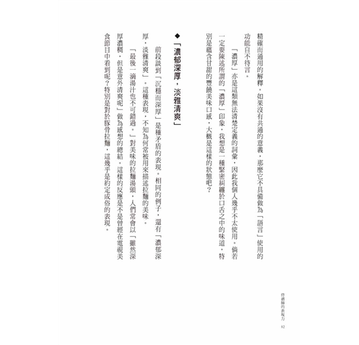 「經過重新訓練的嗅覺與其他感知,再次探索與思考當下的世界與現象,增進自身的觀察力與表現力,自然能增加人生美感的體驗!書中沒有類似小說般太優美的文藻修飾,也無艱澀難懂的微言大義。心直口快、一針見血、敢怒敢言,不難看出作者直爽與富邏輯判斷的個性。」(摘自審訂序)──聶汎勳