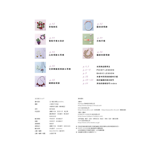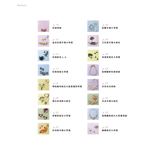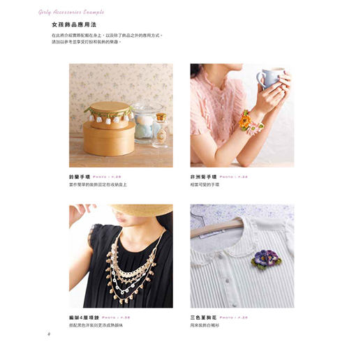 本書中介紹了39款以花卉造型製作的小飾品,其中包括項鍊、耳環、胸花、髮飾、手鍊……等,每一款都是獨一無二的可愛樣式&粉嫩清新的配色,讓專屬於女孩的甜美可愛氣質展露無遺。作法內容中詳盡的將每一件作品的編織編目加以標示,並且搭配上編織圖樣,讓讀者能夠輕鬆的完成每件作品。