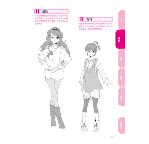 ‧幫助設定角色: 即使是同一件衣服,但不同性格的角色,穿著方式也會不一樣。本書設定四種迥異的個性,搭配專業繪師的插圖呈現,幫助讀者學習不同類型女孩的穿搭方式,利用服裝輔助角色設定。