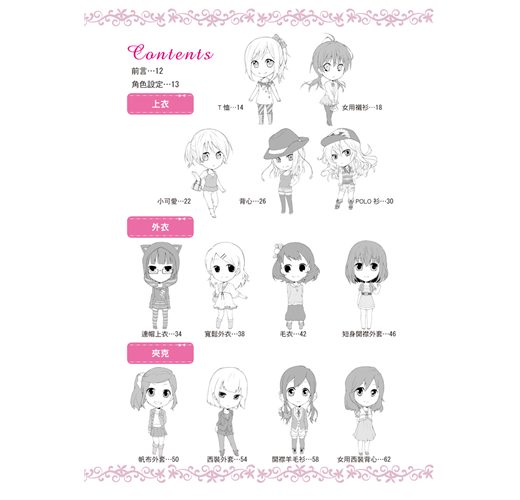 書中依據角色特性變化搭配,分為「可愛」‧「活潑」‧「成熟」‧「奇特」四種風格。不同類型的女孩子,打扮也各有特色,同樣是牛仔外套,文靜型的女孩會選擇短身的版型,裡頭搭配色調清爽的小洋裝,可愛中帶點帥氣。至於在外套裝上鉚釘,搭配吊帶褲襪與皮靴,龐克女孩躍然紙上。