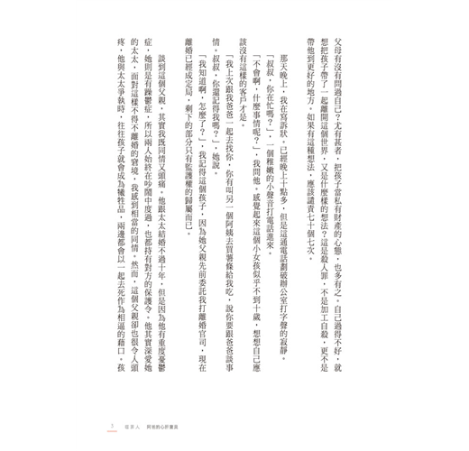 她是個很清秀的女孩子,約莫二十出頭而已。她來找我的時候,脂粉未施,但看起來受到很好的照顧,應該也是很有教養的女孩子。她一開始就小聲的跟我說,「律師,不好意思麻煩您了。」