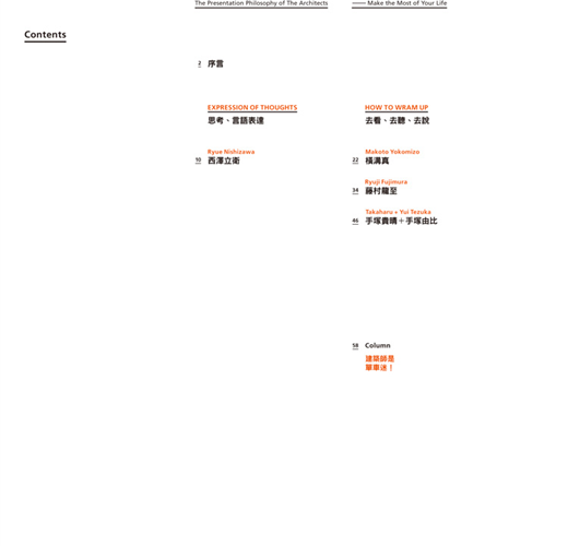 本書收錄15組建築師和設計師,請教他們提案的方法,聊聊提案中遇到的趣事。然而對建築師們來說,提案沒有一套過於制式的技巧,而是由傳達個人想法,與夥伴的默契,以及跟客戶的互動……這一連串事項所組合而成。