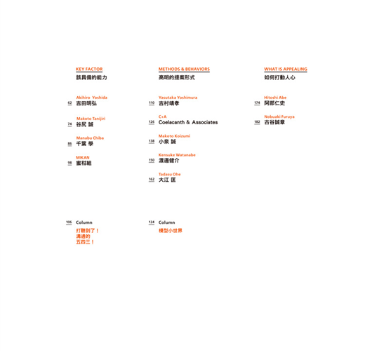 為此,我們採訪了十五組二十位名家,聽取他們對於提案的種種見解,涵蓋哲學與美學、好惡與信念、經驗與未來等而編輯成本書。這十五組觀點與方法論各有獨到之處,全都是正確的、全都是美妙的、全都極具說服力!