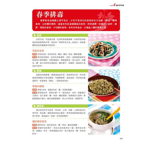 春季排毒、夏季去暑、秋季潤燥、冬季強體,針對四季節氣的變化及人體不同需求,提供養生滋補食譜,達到抗病強身的目的,預約一整年的健康。