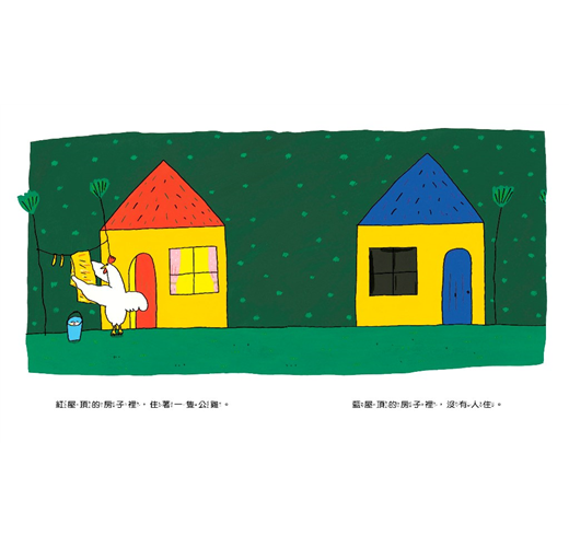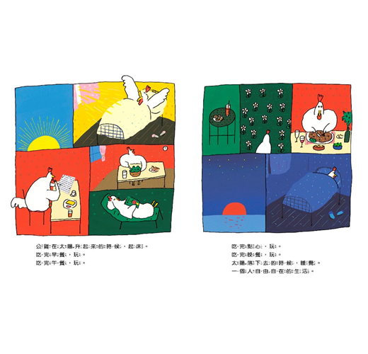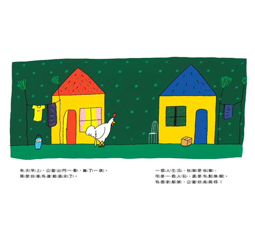 原來,作者巧妙的把兩種作息不同的動物湊在一起,看著他們總是碰不著的煩惱模樣,讀者的心情也被勾著,又是忐忑、又是好笑的。繪者高畠純的圖像有著歡樂明朗的氣氛,展現逗趣的角色性格,看公雞等不及放下手中曬到一半的襪子,就在鄰居家門口探頭探腦,還有梳理雞冠、正襟危坐地等待新鄰居來訪的表情,就讓人忍不住笑出聲來。