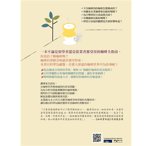 「只要掌握邏輯就可以了解問題的核心……數學是如此,咖啡亦如是。本書作者用淺顯易懂的Q&A,簡單而有邏輯的敘述咖啡的基礎概念……包含了生長、品種、研磨到沖泡……搭配趣味的圖表解說,讓您透過閱讀輕鬆記憶專業知識。誠心推薦給所有喜愛咖啡的朋友!」- 蘇彥彰/暢銷書《咖啡賞味誌》作者、本書審定者
