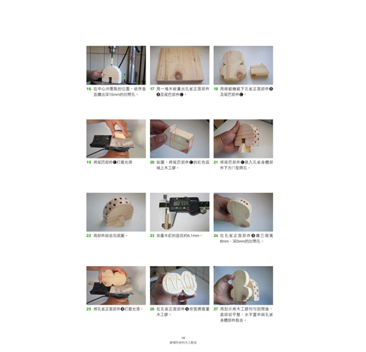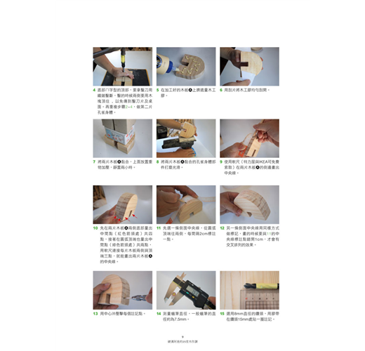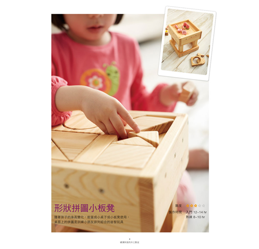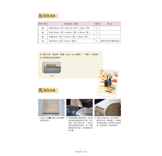 每件作品都有詳細的步驟並搭配圖片講解,即使是沒有任何木工經驗的新手,備妥簡單的工具,學會基礎的技法,就能循序漸進地完成作品。