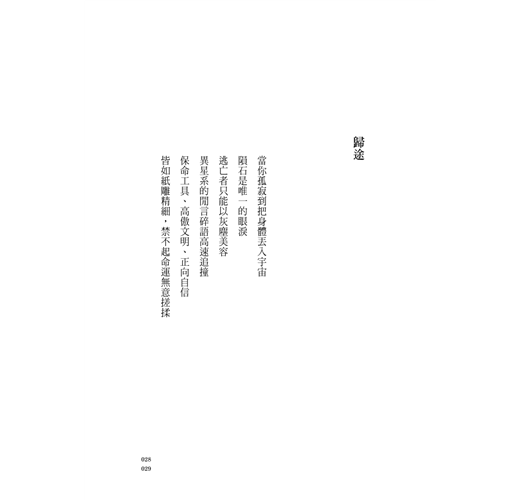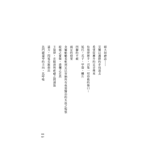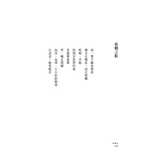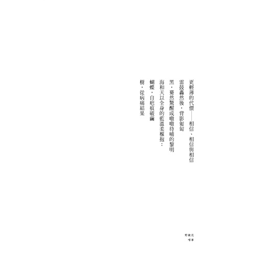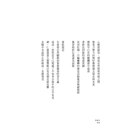 寫詩,對我而言是一條不斷鍛鍊的道路――由生命當中原始如獸的那些單純、熱切與迷茫出發,經過反覆的雕鑿、逼問與壓迫,終能散發出幾許人性獨有的理想光輝與矛盾衝突,並進一步以此為養料,在人生的道路上開闢出幾許美善、幾許真誠與幾許,花。