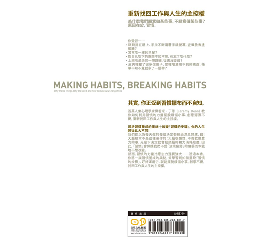 然而,習慣的力量比意志力還要強大——透過本書,你將一窺習慣養成的奧祕,並學習到如何重設「習慣的步驟」,好好運用它,就能擺脫煩惱小事、創意不絕,找回工作與人生的主控權。