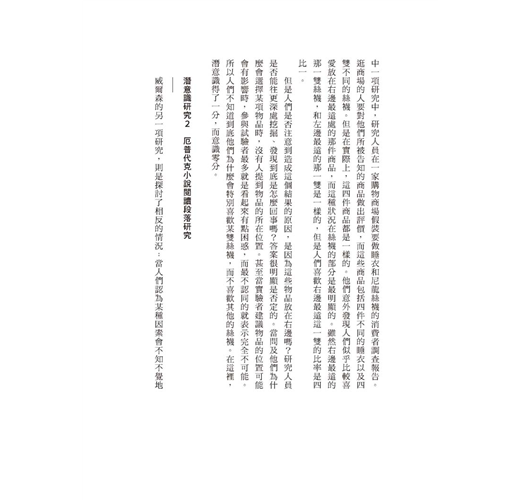 出這些詞句:在知覺上來說,這個速度太快,但是對潛意識來說,這個速度慢得可以被它吸收(這是老套的潛意識廣告詭計,其實來它本來是個騙局,但是很有用)。閃在螢幕上的字有「鍋」、「亞洲」、「中國城」、及「香港」等等。另一半的受測者,則是看到一些跟種族刻板印象無關的字眼。再一次地,我要跟亞洲人道歉,潛意識沒有應有的「政治正確」觀念。
