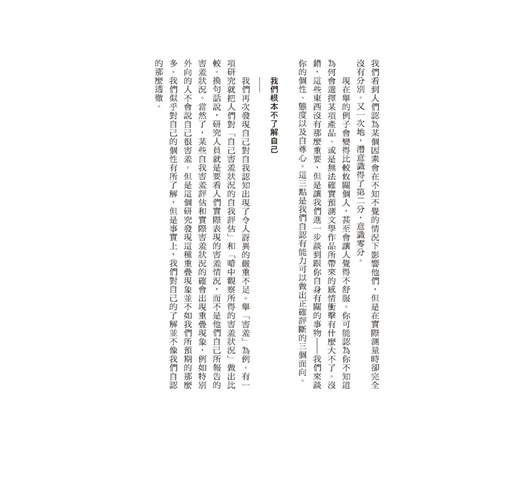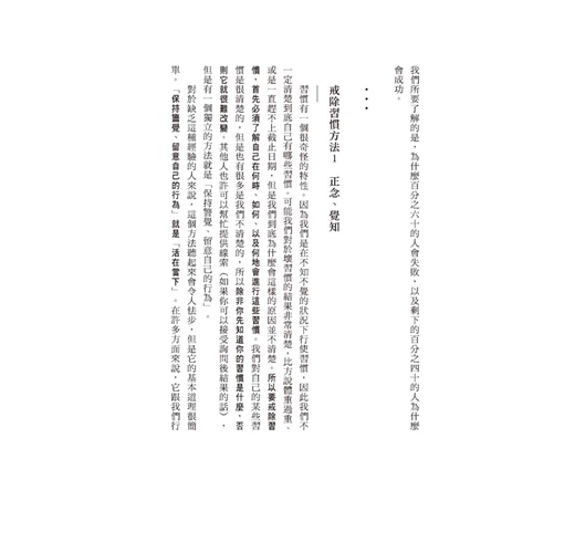 2. 以正向思考引導讀者看待「習慣」的力量──「行為」是「想法」的產物,只要改變「想法」就可以讓習慣(行為)戰勝意志力,達到意想不到的效果。