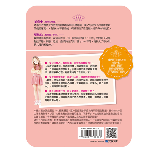 本書針對女孩成長的10大重要層面,逐一發掘現今家庭教育所面臨的難題,書中的100個生活教養例子,以及100個教養女孩的實用重點,不多不少,恰恰能幫助你透過這些日常的微小細節,尋得最佳解決方式,進而建立良性的親子關係循環。