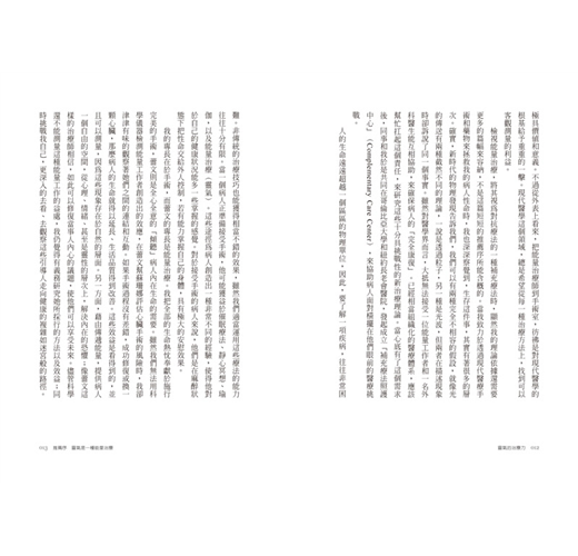檢視能量治療,將其視為對抗療法的一種補充療法時,顯然我的理論依據還需要更多的篇幅來容納,不是這篇短短的推薦序所能涵蓋的。當我致力於透過現代醫療手術和藥物來拯救病人性命時,我也深深察覺到,生存其實有著很多的層次。確實,新時代的物理發現告訴我們,我們可以有兩種完全不相容的假設,就像光的傳送有兩種截然不同的理論,一說是透過粒子,另一種是光波,但兩者在描述現象時卻訴說了同一個事實。雖然對醫學界而言,大抵無法接受一位能量工作者和一名外科醫師能互相協助,來確保病人的「完全康復」。已經相當組織化的醫療體系,應該幫忙扛起這個責任,來研究這些十分具挑戰性的新治療理論。當心底有了這個需求後,同事和我於是共同在哥倫比亞大學醫學中心/紐約長老會醫院,發起成立「補充療法照護中心」(Complementary Care Center),來協助病人面對橫擺在他們眼前的醫療挑戰。
