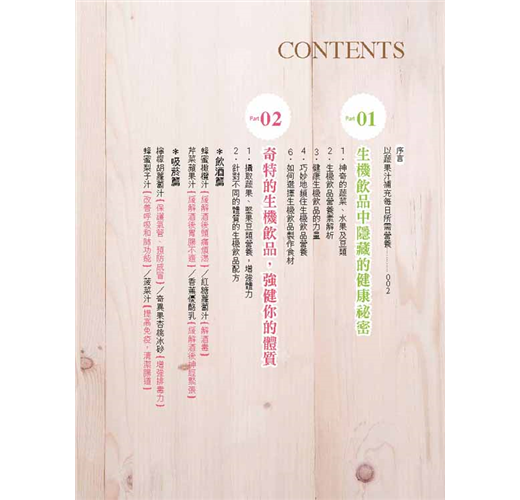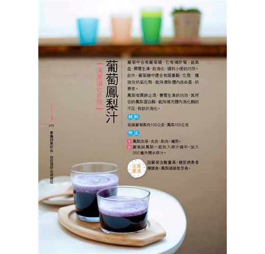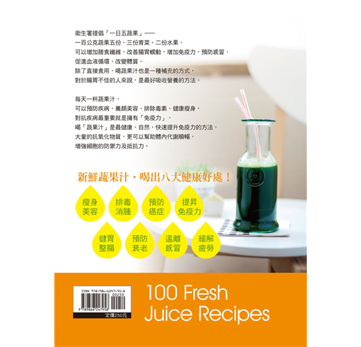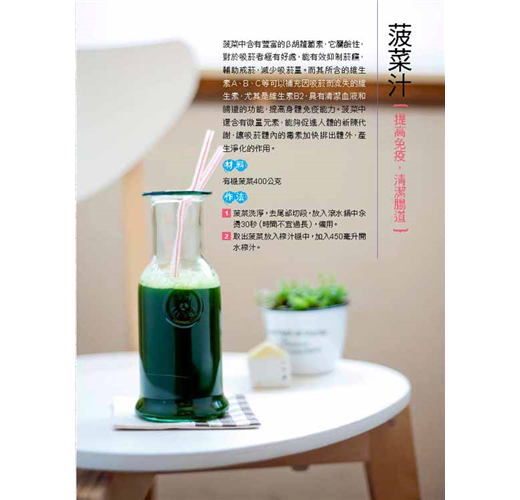 本書100道健康蔬果汁,有提神醒腦的「山藥蘋果優酪乳」、緩解焦慮失眠的「蜂蜜紅棗汁」、抗癌的「木瓜汁」、排毒減重的「荔枝蘋果汁」、美白的「葡萄檸檬汁」,餐餐讓你擁有美味及好氣色,健康不生病。