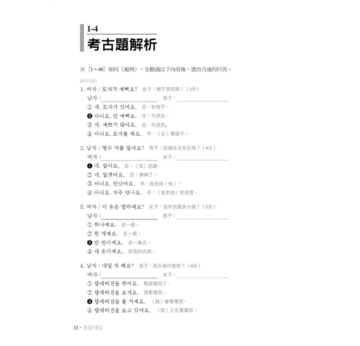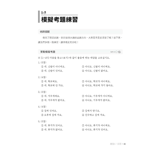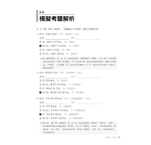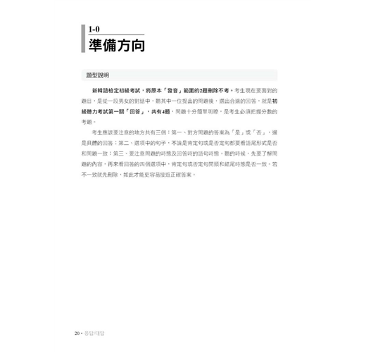 新韓語檢定,考生一開始要面對的題目,是從一段男女的對話中,聽一個人提出的問題後,再選出合適的回答。共有4題,問題十分簡單明瞭,是考生必須把握分數的考題。