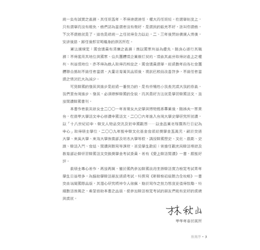 裴碩士專心著作,再接再厲,鑒於國內參加韓國政府主辦韓語實力檢定考試青年學生日益增多,為協助學韓語朋友通過考試,特撰寫《新韓檢初級聽力全攻略》一書交由瑞蘭國際出版,其潛心研究精神令人敬佩,勤於寫作之努力態度更值得鼓勵,特綴數語推薦之,希望借助本書之出版,使參加韓語檢定考試的朋友們能有更好的成績與成就。