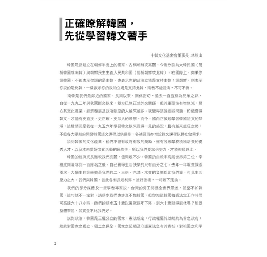 南韓是我們最鄰近的國家,長期以來,關係密切,過去一直互稱為兄弟之邦,自從一九九二年與我國斷交以來,雙方已無正式外交關係,但其重要性有增無減,關心其文化產業、經濟發展及政治制度的人越來越多。我覺得談論這些問題,如能懂得韓文,才能有更直接、更正確、更深入的瞭解。而今,國內正掀起學習韓國語文的熱潮,這種情況是我從一九五六年學習韓文以來難得一見的盛況,且有越來越旺之勢,不但各大學紛紛開設韓國語文課程以供選修,各補習班亦增設韓文課程以供社會需求。