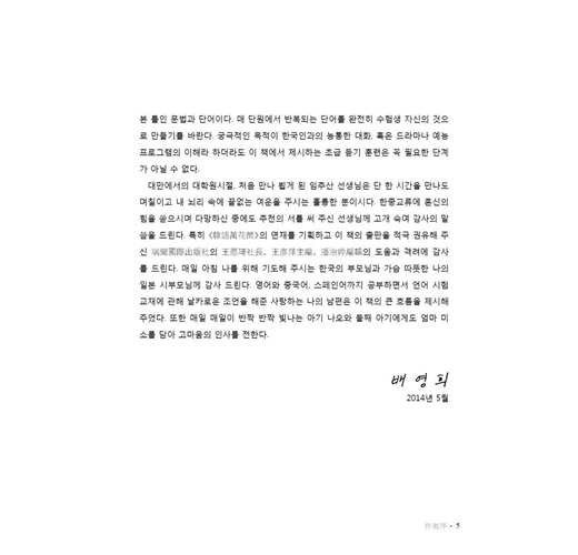 我於台灣就讀研究所期間第一次見到傳聞中的林秋山老師,即使與老師的見面時間短暫,但在我腦海中留下無盡餘韻,他就是一位能讓我思考更遠的目標、很有影響力的人物。老師在傾心盡力忙於台灣與韓國的交流中,仍願意撥冗為我寫推薦序,在此想對林秋山老師致上無盡的謝意。另外,非常感謝瑞蘭國際出版的王愿琦社長、王彥萍主編及潘治婷編輯的幫助與鼓勵,讓我有機會在《韓語萬花筒》連載韓語檢定初、中級考題,並積極勸進我出版此書。此外,要特別感謝遠在韓國每天早晨為我禱告的父母親,及謝謝在日本的公婆溫暖的胸襟。還有在學習英文、中文甚至西班牙語的老公,由於他給了我許多語言檢定書籍的相關建言,才帶給了我此書的大方向,非常感謝。最後,我要給每天都閃耀光芒的寶貝女兒Nao及肚子裡的小川村,我要以媽媽的微笑致謝。