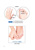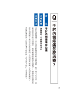 作者表示所謂治療的痛點,就是在對應部位按壓,尋找出特別痛的點,即是治療點,只要找出正確的治療點,持續按摩刺激數分鐘後,應會立即見效,如果功效不明顯,換另一邊再試試,以改善患部的情況為參考標準。