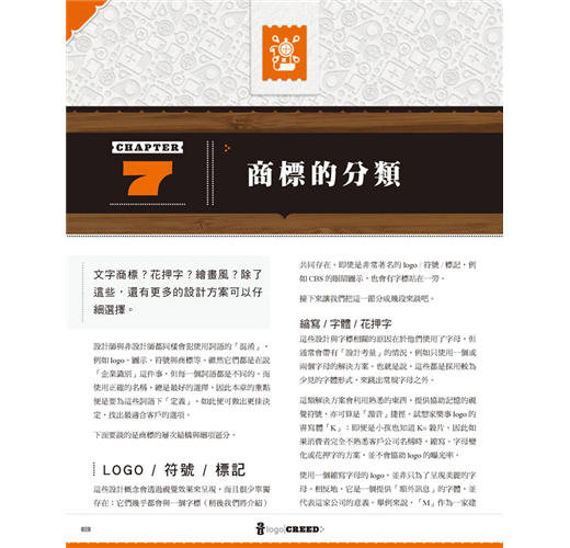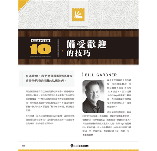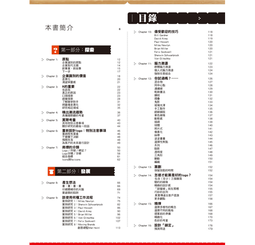 發展創意的過程:產生想法、個人與團體的腦力激盪、主流設計師偏好的技巧與流程、偉大logo的組成元素、精煉出最佳方案