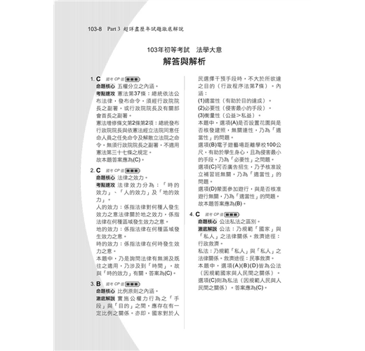本書解析之命題核心,係就各題常考的重點和關鍵字詞,予以提要,使同學能夠運用聯結記憶法精準複習,在這題輕鬆拿到更多的分數。同學倘若行有餘力,則可以此來檢索深入資料,精進自我的實力。