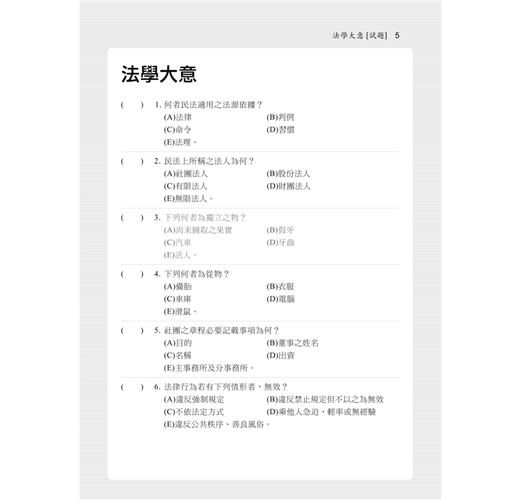 本書針對各題測驗題,題題詳解,不僅附上相關主題的重點,更稟持「舊題新解」方式,全盤融合了國內主要學者專家之相關論著,作各種角度的解析,引導讀者了解最新命題趨勢,深諳最正確、即時的法規,從而掌握讀書方向,使讀者閱讀達其事半功倍之效。