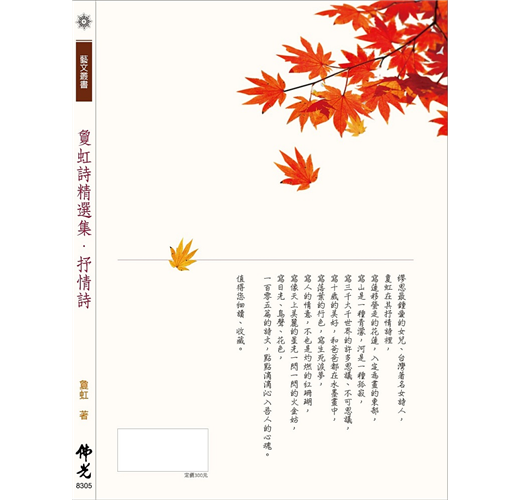 本書具有辭美意深的特色,一首首的詩篇,意境優美,輕婉流利,意韻諧美。寫山是一種青濛,寫河是一種孤寂,寫三千大千世界的許多思議、不可思議,寫落葉的行色,寫生死淚夢,點點滴滴沁入吾人的心魂。