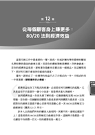 獨創80/20速讀設計:本書精要段落特別設計「80/20 法則必通重點」標誌,忙碌的讀者只要掌握這些內容就能輕鬆吸取八○%關鍵知識,化解行銷困境。