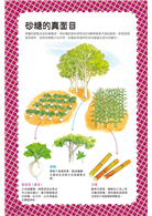 本書的另一個特色就是品種介紹非常豐富,當然書裡面講的「品種(cutivar)」,在植物學上也包括一些「物種(species)」。如長在地上的「菜」類中的蔥類、番茄、茄子、胡瓜、南瓜、辣椒等;長在地裡的「菜」類中的馬鈴薯、甘藷、芋頭、蔥蒜、蘿蔔、蕪菁、胡蘿蔔等;水果中的蘋果、桃李、梨、柑橘類(含酸用柑橘)、葡萄、 子、草莓、香瓜、獼猴桃;五穀雜糧類中的玉米、大豆、菜豆等。上述的例子中,尤其是蘿蔔的介紹,包括不同形狀(細長、長、圓)、皮色(白、紅、綠、黑)、肉色(白、紅、綠)、皮色及肉色的組合(白皮白肉、白皮紅肉、紅皮白肉)等,琳瑯滿目;尤其有一個各類蘿蔔地上及地下部的剖面圖,真是精彩,讓後學想起小時候讀到有關拔蘿蔔的故事,還真有其事。這些在日本市場常見的蔬果類,它們多彩多姿的品種,真令人大開眼界。