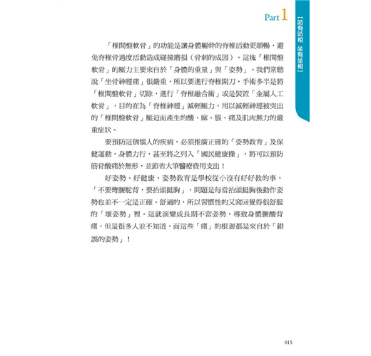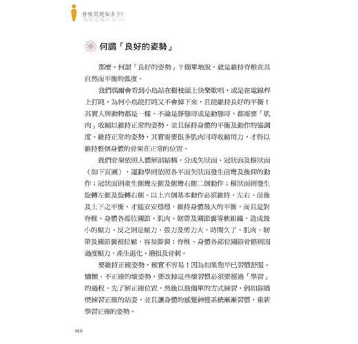 患者很好奇,後來我的問題是怎樣好的?吃了何種藥?做了何種治療?希望我把「祕方」公諸於世。十幾年來,我與許多病患朋友分享個人的經驗,我告訴大家,為一的解藥就是「好姿勢」!大家頗為驚訝,不過我都不厭其煩地帶領大家親身體會其中的奧祕,終於讓大家了解「好姿勢」的重要性,絕對是比藥物治療、手術治療或是按摩,更徹底的治療方法。