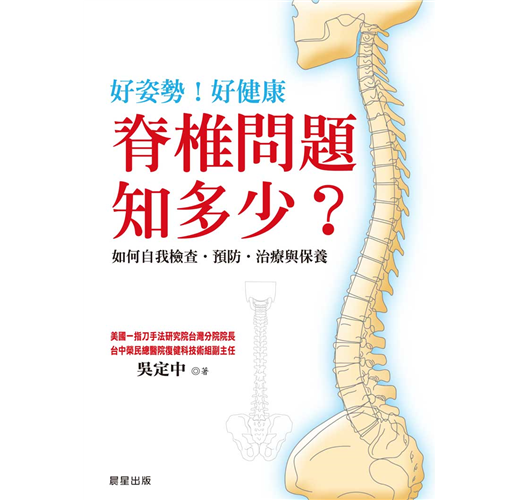 為了希望幫助更多病患,個人十幾年來常常應邀到中小學、扶輪社、獅子會、消防局、警察局、農會及許許多多社團,推廣「好姿勢好健康」的健康保健觀念,強調預防保健,獲得非常熱烈的迴響,咸認「最好的治療,就是預防」;所以,我97年9月開始受邀在台中榮總院刊「中榮醫訊」開闢「寶貝身體系列」衛教文章,一直到現在仍舊持續發表文章,只要能幫助病患了解本身的問題,就感到非常欣慰!許多病友認為文章實用,淺顯易懂,鼓勵我將文章集結成冊,再增加一些內容,讓更多的民眾受惠。感謝晨星出版社陳董事長的鼓勵與協助,能讓這本書與大家見面,相信能對大家的脊椎健康有所助益。