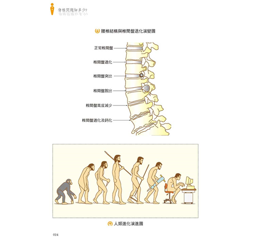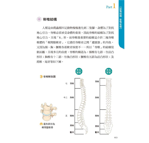 人類是由爬蟲類四足動物慢慢進化到二隻腳,身體為了對抗地心引力,脊椎承受身體的重量,脊椎的結構為了對抗地心引力,呈現「S」形。脊椎最重要的結構是介於二塊脊椎椎體的「椎間盤軟骨」,它擔任脊椎骨之間的「避震器」,又因為頸、胸、腰椎各部軟骨厚度不一,所以「脊椎」的結構從側面觀,呈現多元的曲度。脊椎的構造為:頸椎有七節、往前凸;胸椎有十二節、往後凸;腰椎有五節為前凸;及薦椎、尾骨等。