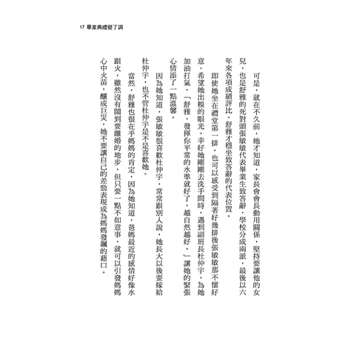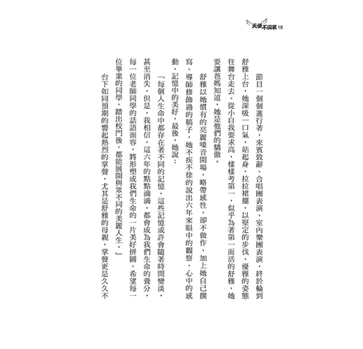 在這篇小說裡,作者並不出面說教。她僅僅借用黃舒雅的好朋友「小文」口中的一番話,替她說出對「生命」的正確看法,以及另一個好朋友「跳跳球」從小演員變大明星的故事,讓她懂得珍惜擁有的幸福。這是這篇小說比較嚴肅的部分。嚴肅是嚴肅,我們卻已經把這篇好看的小說看完了。