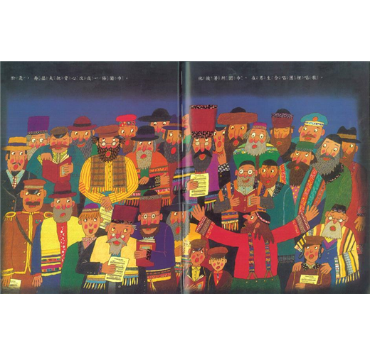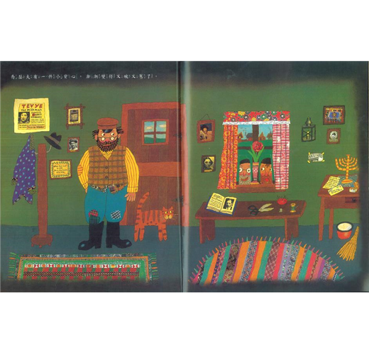 圖畫書裡處處充滿巧思,仔細觀察每一幅畫,不但呈現出二十世紀初波蘭猶太民族的生活概況,像牆上的布畫,仔細一看原來是一則一則的猶太俗諺。