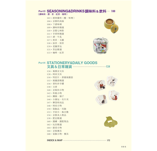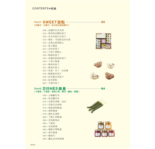 《京都伴手禮》是一本囊括京都所有百年老店的伴手禮種類,包括各式各樣的和洋菓子、京漬物、下酒菜、調味辛香醬料、茶品咖啡、京風文具小飾品等超過500種品項,甜點有各式各樣的和洋菓子18類,美食包括下飯菜、下酒菜、家常小菜、壽司、麵包、果醬共15類,調味料及飲料12類,京都風文具生活雜貨21類,更特別的是還有京都的高湯與銘酒都可以打包帶回來。