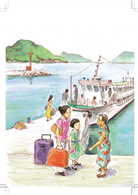 媽媽朝流浪漢大叔瞪了一眼。美珠跟著媽媽走出售票大廳。開往花島的船在海上浮動著,正準備出發。美珠小心翼翼的走上甲板。