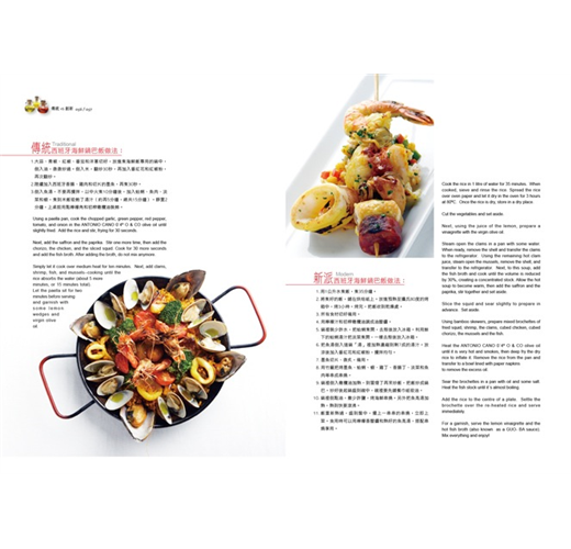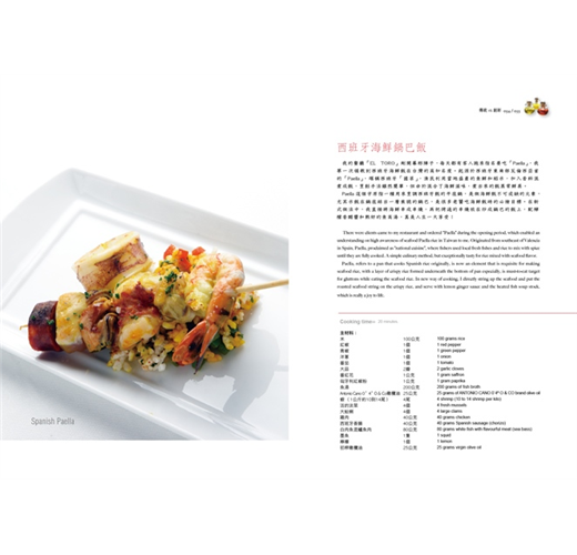 「西班牙大廚到你家」是他的第一本中英對照食譜,在這本食譜書裡,他嘗試把西班牙每個地區的特色菜都納入進來,例如東半部的西班牙海鮮飯、西部的章魚、北方的雞肉和南邊的冷湯等等。
