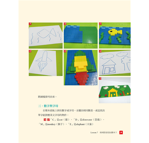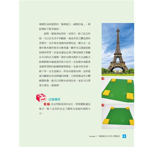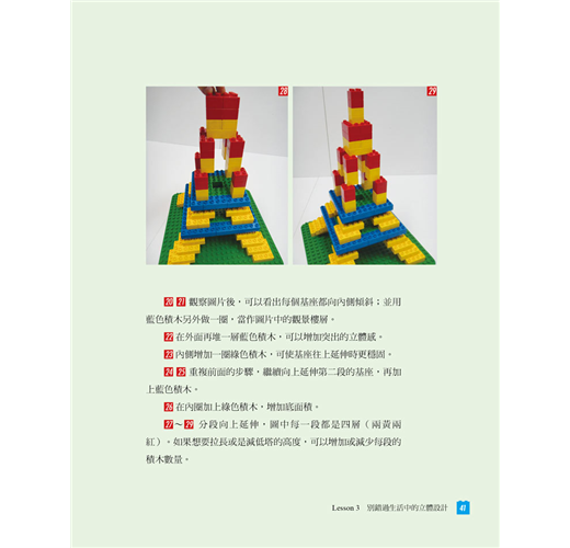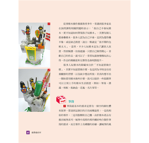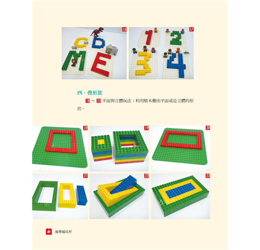 孩子在出生後到大約四歲之前,幾乎是運用感官在探索、察覺和認識周遭環境,這是一種發自本能的學習和成長模式。給四歲前的小朋友玩積木時,感覺他好像沒疊出什麼,或是認為他在亂玩,其實在觸摸與觀察的過程中,孩子已經在吸收、進步與學習,並加深對積木的印象。這樣的探索過程很容易被大人直覺認為是在「亂疊積木」,卻忽略了他正在運用觸覺、視覺和聽覺來熟悉環境以及認識積木零件。若能適量增加學齡前孩童的感知活動量,能提升孩童對於環境的適應力;而在接收各種身體感知訊息後,表現出適切的反應,有助於孩子情緒的穩定、認知與學習、人際關係的建立等。年紀越小的孩子越需要家長陪玩積木,因為堆疊積木需要倚賴生活中的視覺印象和經驗,甚至需要大人提供操作上的協助。四歲前的小朋友獨自玩積木時,家長其實不需要太在意孩子亂玩,而應該盡量陪他一起玩,從旁輔助,讓堆砌積木更具象化。本書後面的篇章將提供家長一些帶領學齡前小朋友共同操作積木的遊戲方式。