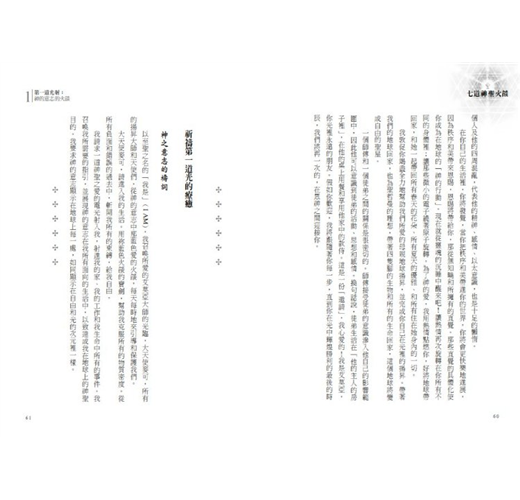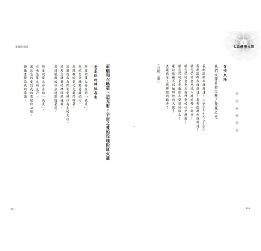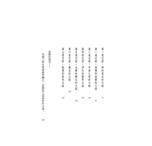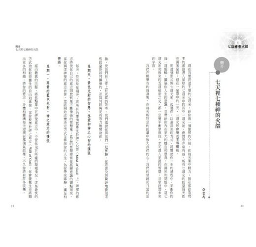 這七道火燄均是宇宙中難能可貴的氣能,每一道對應專屬的大天使、古希伯來神及揚昇大師相關的屬性與活動,你可以透過書裡的帶領進行召喚和祈請,也可以在靜心中觀想,允許這些能量灌注你生命中的各個面向。