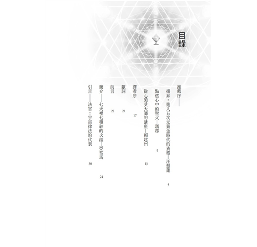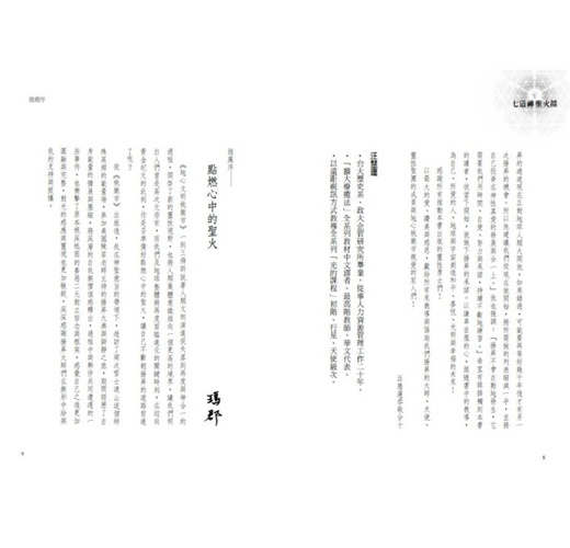 在過去,有關七道神聖火燄(或稱七道光)的訊息與教導,一直處在祕密的狀態,很少人有機會接觸。擴大療癒法三階,透過宇宙的創造神埃洛希姆(Elohim,本書譯為以羅欣),將七道光的內涵、品質、守護者(Chohan,本書譯為霍汗)、大天使們介紹出來,並教導我們創造與顯化的步驟。現在,透過生命潛能出版社的慧眼,將更多、更詳實的有關七道神聖火燄的「智慧與知識的珍珠」帶給我們,表示台灣寶島、華人世界有許多人的意識已經達到靈性成熟的階段,準備好來接收這高頻的教導。