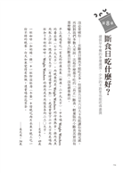 ■斷食日吃什麼好─沒必要唬你,在斷食日雖然不能吃太多,但就算五百至六百大卡也能讓你有飽足感。提供早午餐的多樣選擇,少少的卡路里也能吃得盡興(內附:簡易低卡食譜一葷兩素的食物組合、常用食材與熱量對照表)