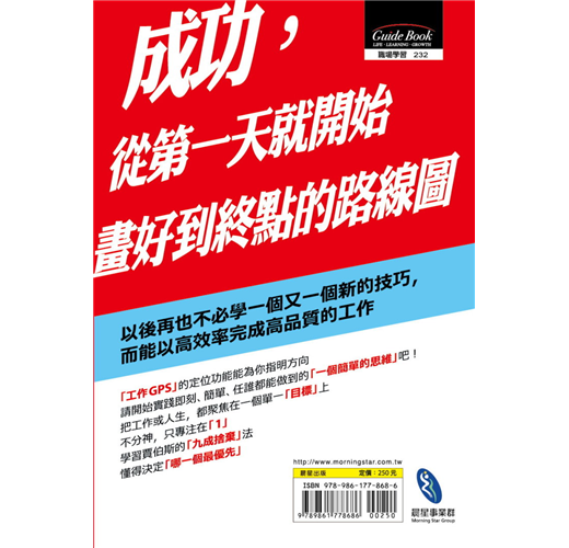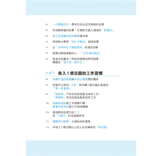同理可證,你的工作也可以因「一個簡單的思維」而產生重大轉變。在本書中登場的人物,從史蒂夫.賈伯斯(Steve Jobs)到年收入達一億日元的人們,他們的成功史也都從「一個簡單的思維」開始。其內容讓我們留待正文再敘,本書將詳盡傳授從「一個簡單思維」達成「高品質高效率工作技巧」的具體實踐方法。