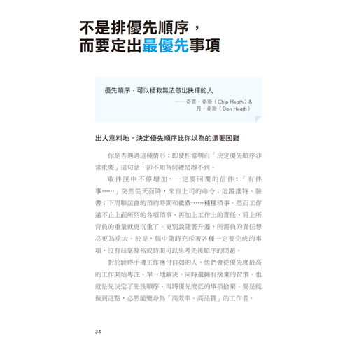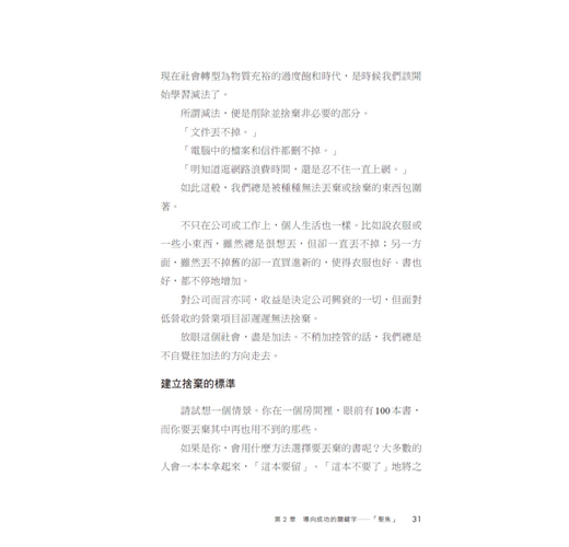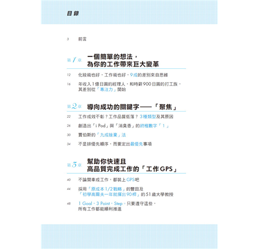 在本書的第1章,首先介紹「一個簡單的思維」;接著從第2到第5章傳授實踐的方法。當你讀完本書並加以實踐後,某一天將會突然發現,自己的工作質量與效率已然大大提升。