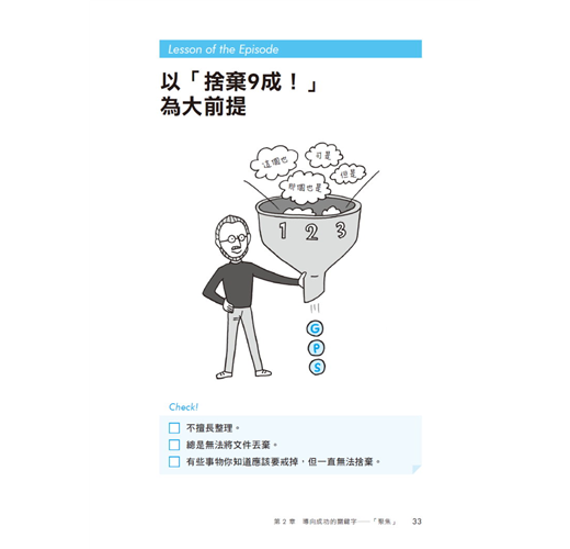 「比起上百種技巧,一個簡單的思維更能改善你的工作。」本書正是為了傳達這個能改善工作效率與品質的「一個簡單思維」而作。作者也在書中示範如何運用「工作GPS」,將3噸容量卡車的資料精簡為4張半榻榻米的量,不只是這樣,還提供一個超級實用的工具──「Solution Box」,這個工具可以將複雜問題分解、簡單地解決。