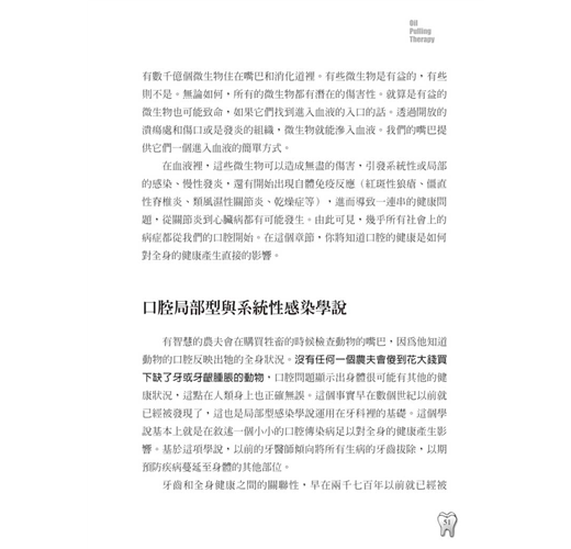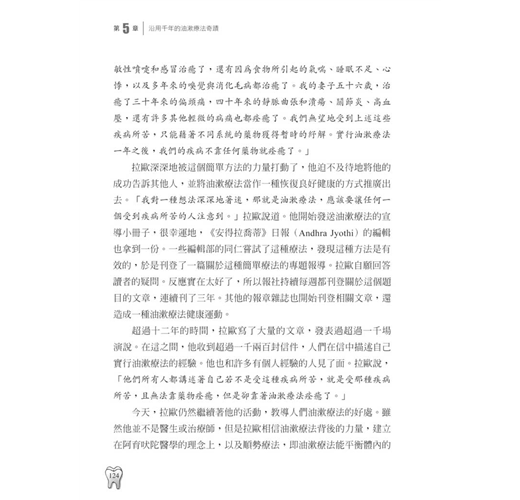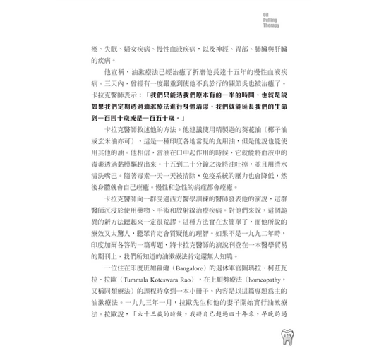 並提供一種簡單人人都能做的治療技術「油漱療法」:用油清潔口腔讓身體達到排毒與治療的功效