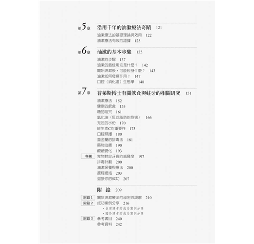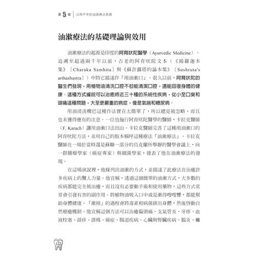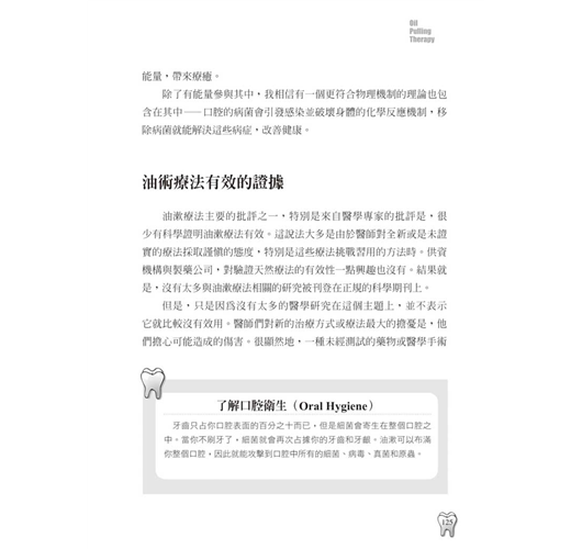 5. 將油漱療法的原理、實行過程與變化、以淺顯易懂的方式說明,讓讀者認識、並了解新療法的用途與效果。